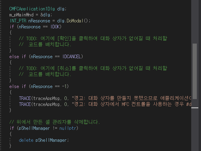 - 이 함수에서 리턴해주는 값은 위에 InitInstance함수에서 CMFCApplication1Dlg 의 인스턴스를 생성해서 DoModal 함수의 리턴 값을 받았잖아요? 그 리턴 값 입니다.