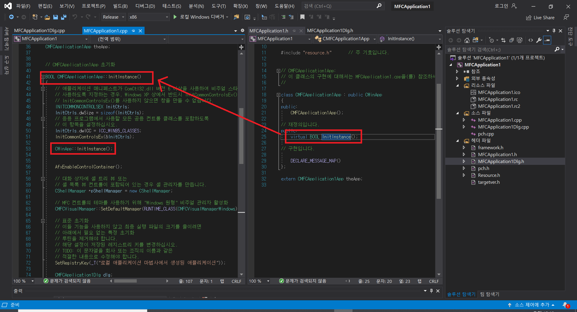 - CMFCApplication1App이 상속받고 있는 CWinApp의 InitInstance 함수를 호출합니다. 이 프로세스의 초기화 루틴에서 해야할 동작들은 CWinApp의 InitInstance 함수에 이 프로세스의 초기화 루틴들이 이미 있어요. 내가 만드는 프로그램은 이 함수를 호출해주기만 하면 됩니다.