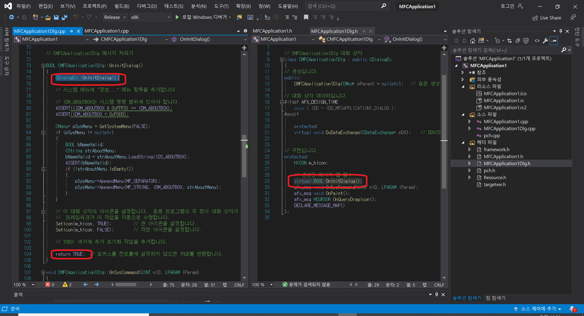 - 얘도 마찬가지로 CMFCApplicaion1Dlg가 상속받고 있는 CDialogEx 의 OnInitDialog 함수를 호출합니다. 윈도우를 생성할 때 필요한 초기화 로직들인 CDialogEx의 OnInitDialog 함수에 이미 구현되어 있고, 이 구현된 함수를 우리는 호출해주기만 하면 됩니다.